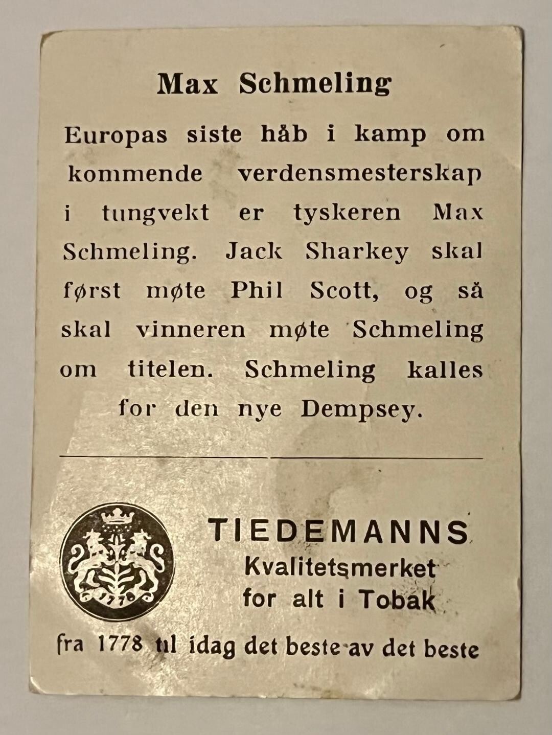 Max Schmelling, Germany heavyweight champion boxing. Collectorcard Tiedemanns tobak