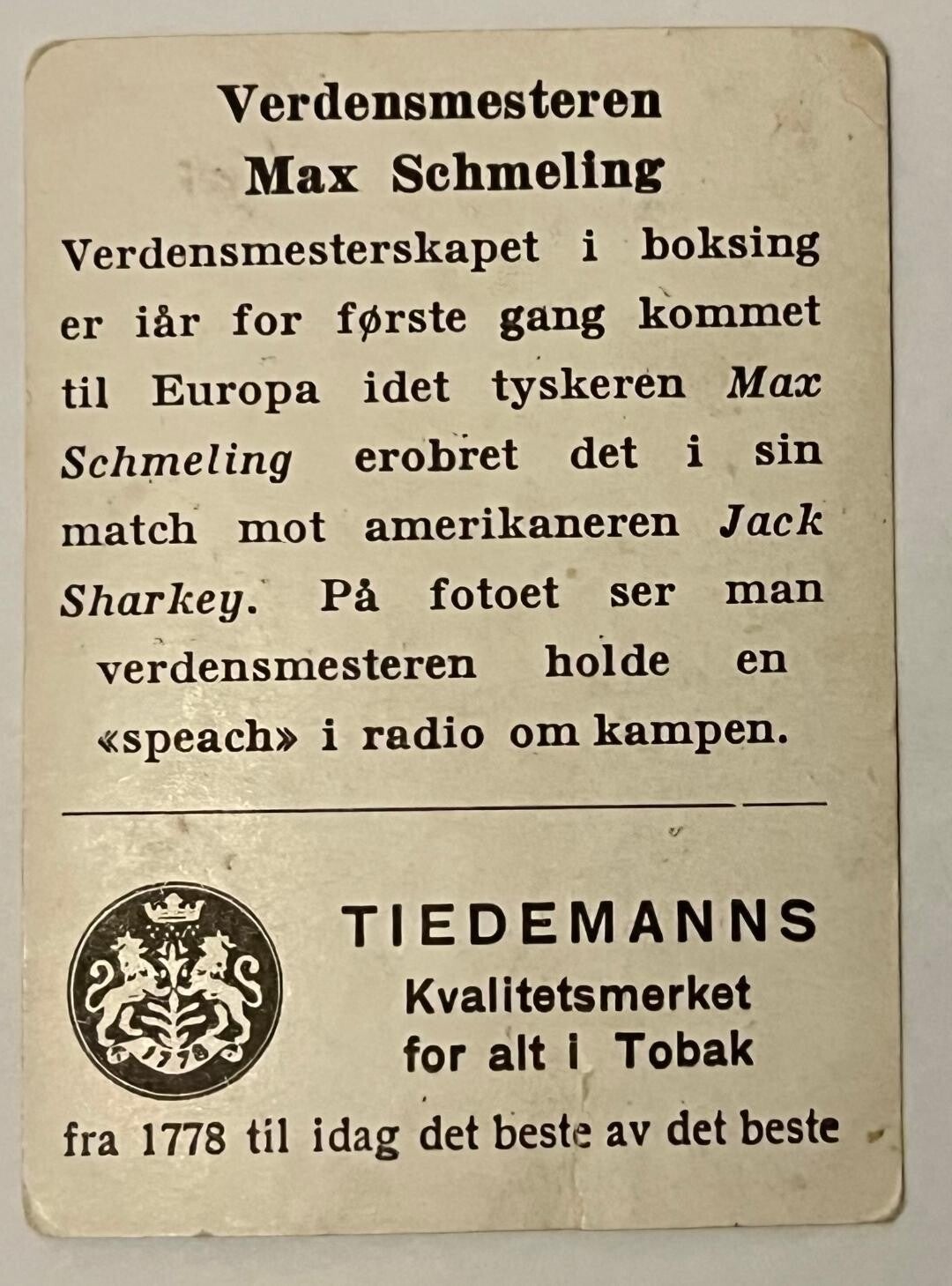 Max Schmelling, Germany heavyweight champion boxing. Collectorcard Tiedemanns tobak