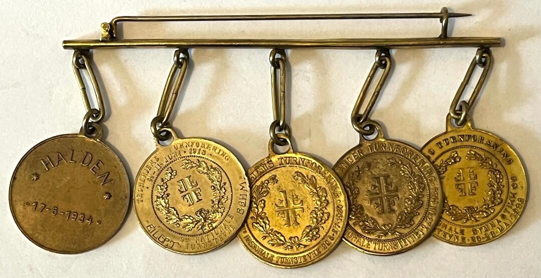 Medaljen fra 1918 er gravert inn Eilert Bøhm. Han var en av 20manns troppen som tok sølvmedalje i lagturn i OL 1920 Antwerpen